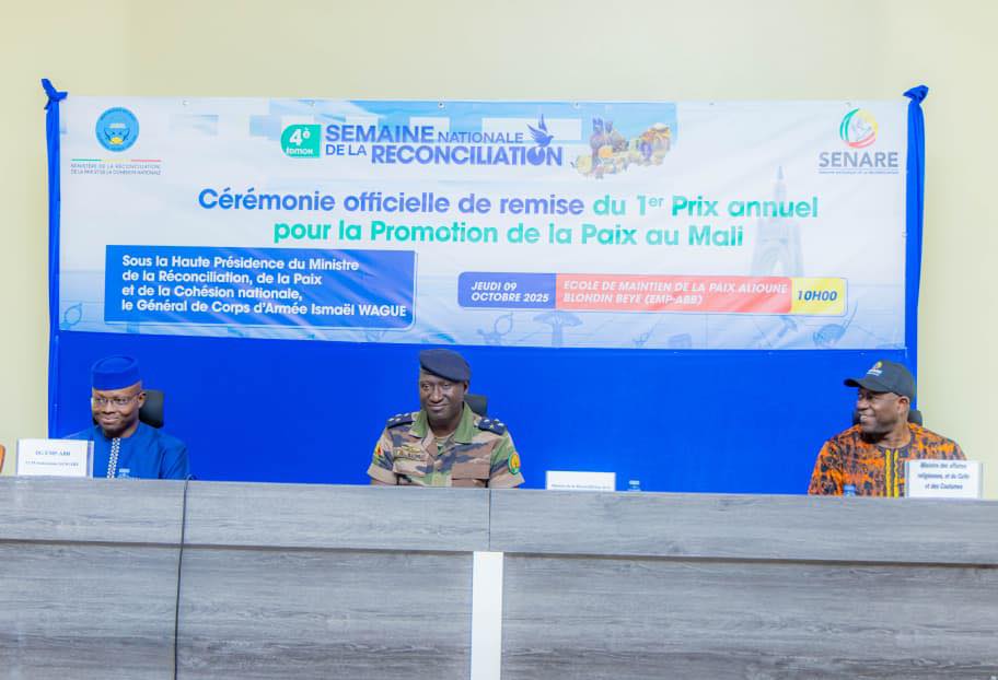 Le jeudi 09 octobre 2025, l’École de Maintien de la Paix Alioune Blondin Bèye (EMP-ABB) a abrité la cérémonie officielle de remise du 1er Prix Annuel pour la Promotion de la Paix au Mali, organisée dans le cadre de la Semaine nationale de la Réconciliation.